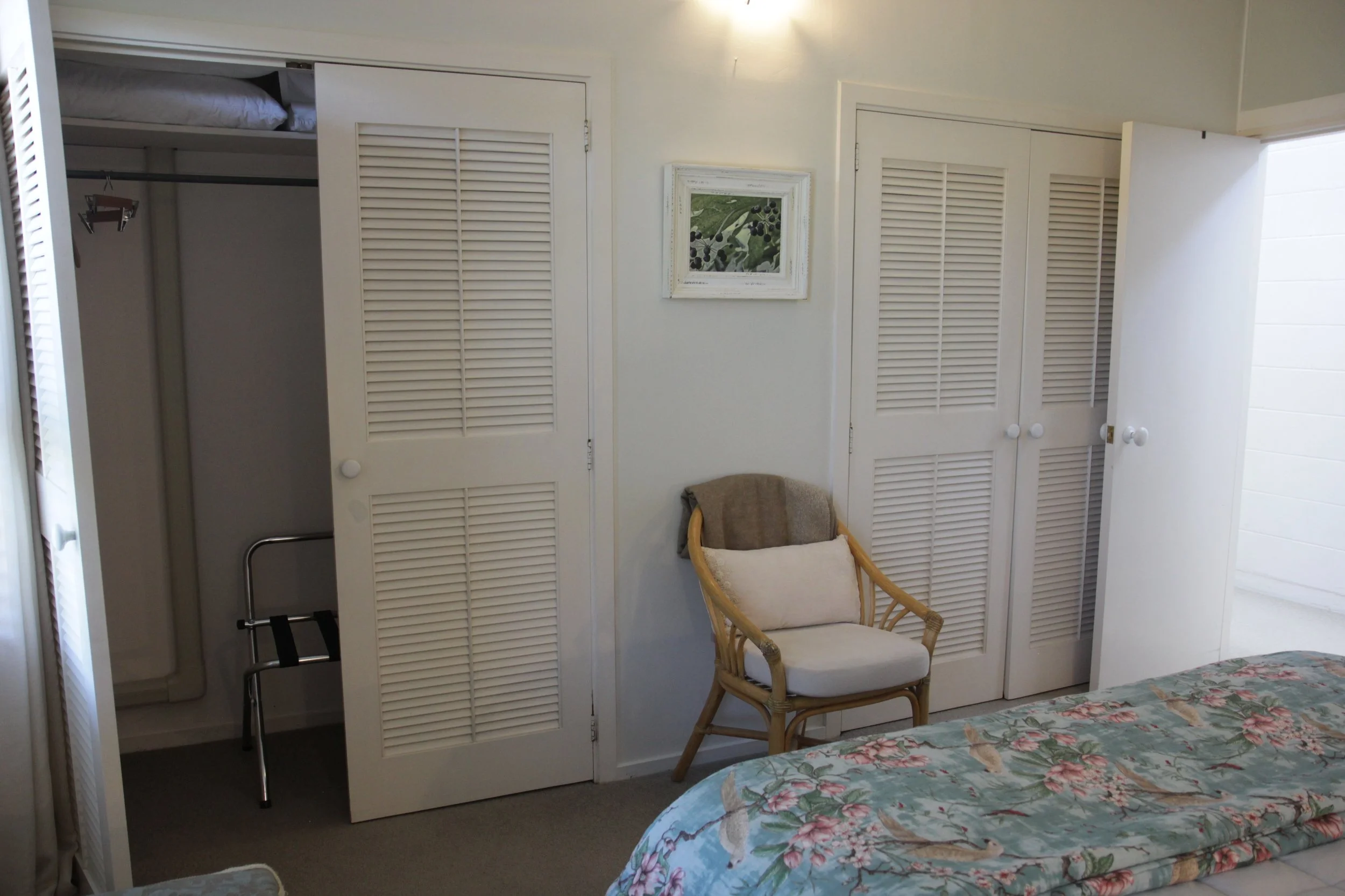 A cute and cosy room with a smaller double bed, Ideal for extra family or friends or if you as a couple prefer your own sleep space. High thread count sheets and quality linen bedding provide for a refreshing night’s sleep. The built-in wardrobe has a luggage rack and plenty of hangers. Freshly laundered bathrobes and extra bedding and pillows are also supplied. The window has shutters and a blind. A wall heater and electric blanket keeps you cosy in winter.